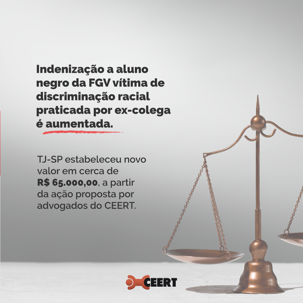 A indenização a João Gilberto Lima - aluno negro da Fundação Getúlio Vargas (FGV), vítima de discriminação racial praticada por Gustavo Metropolo - foi aumentada em decisão do Tribunal de Justiça de São Paulo, em ação proposta por advogados do CEERT. A decisão do tribunal paulista estabeleceu novo valor indenizatório em cerca de R$65.000,00.